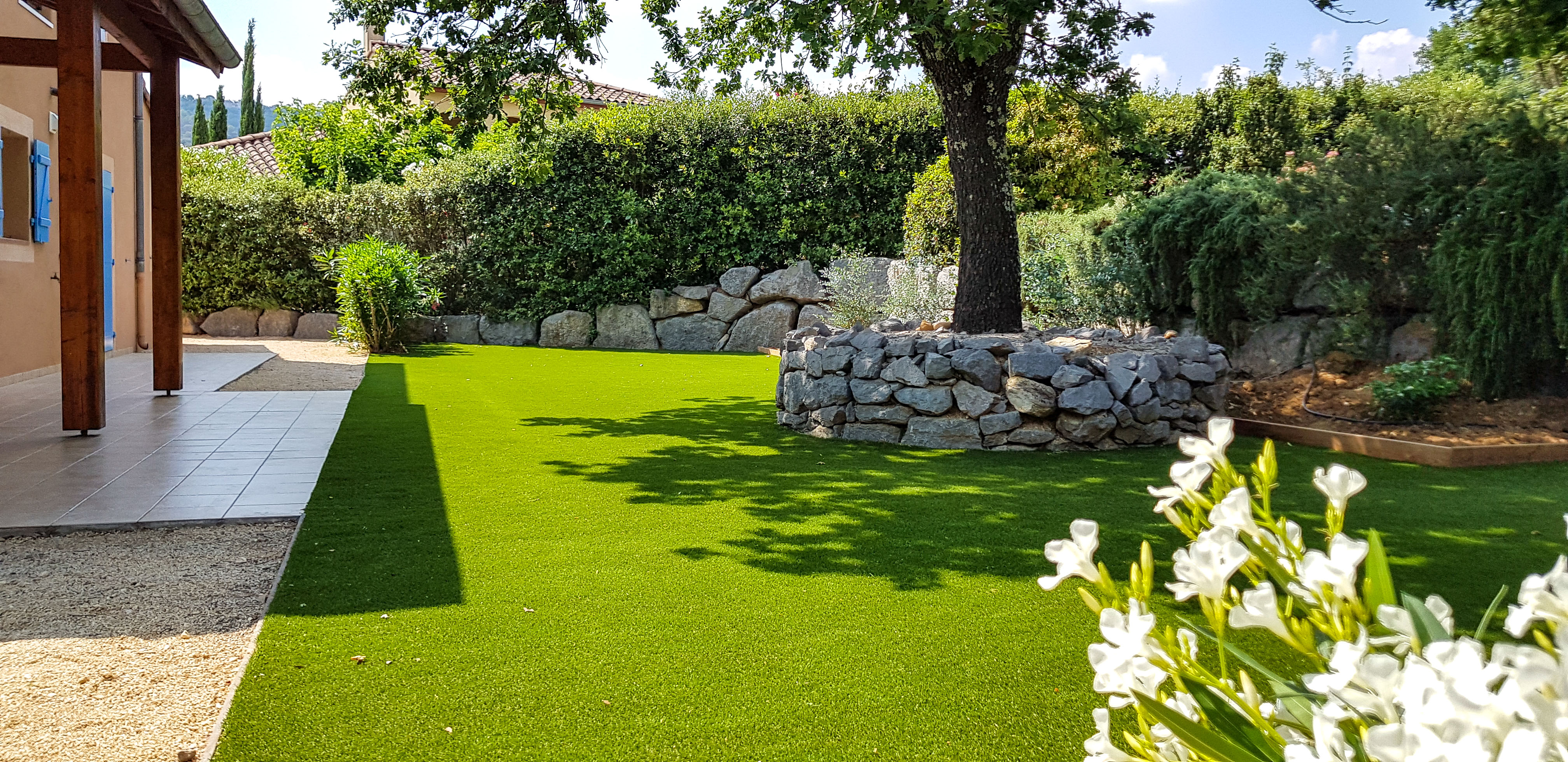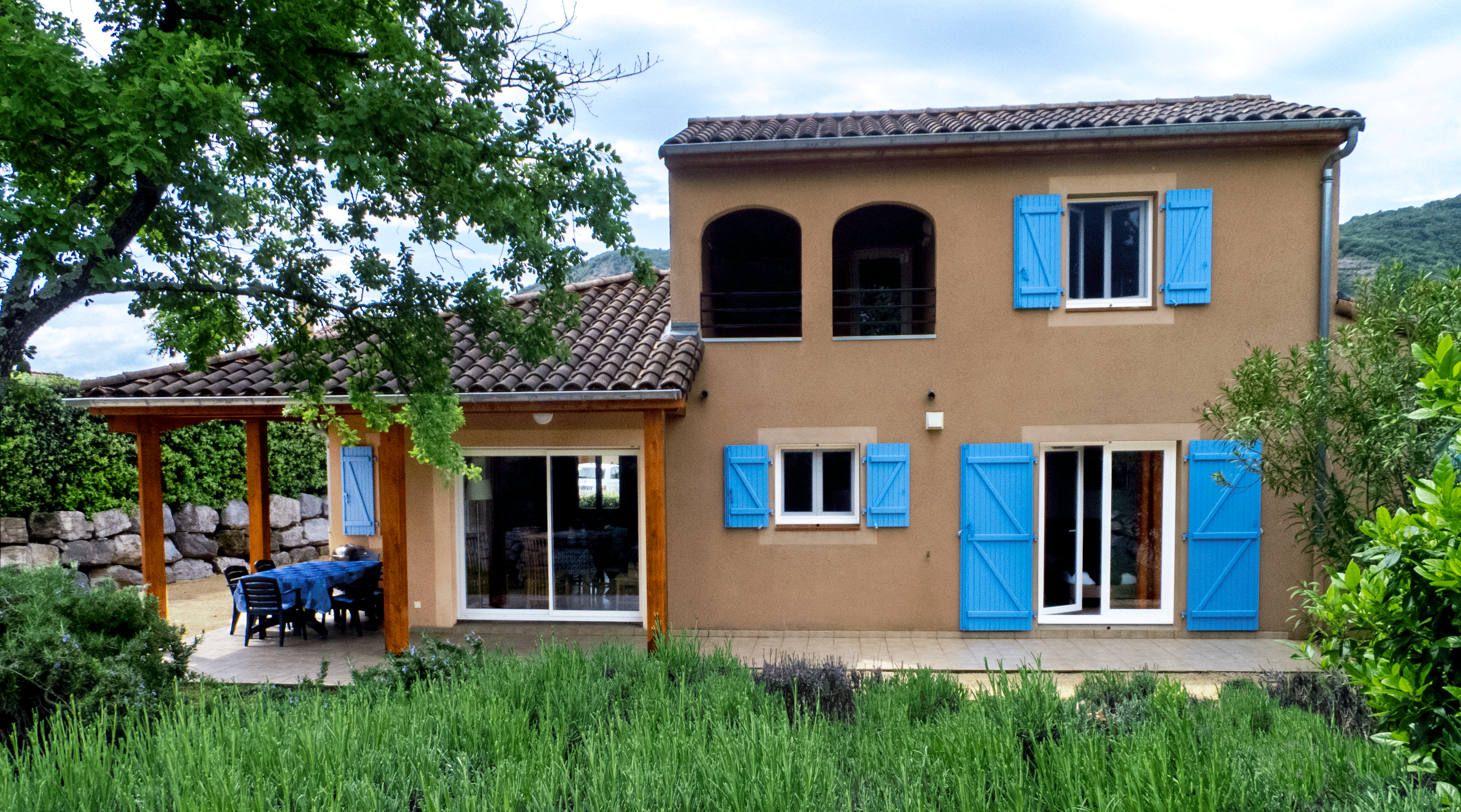 Terras achter de villa, u kunt hier in de zon zitten op het hoger gelegen deel of in de koelte van de schaduw onder de eikenboom.
