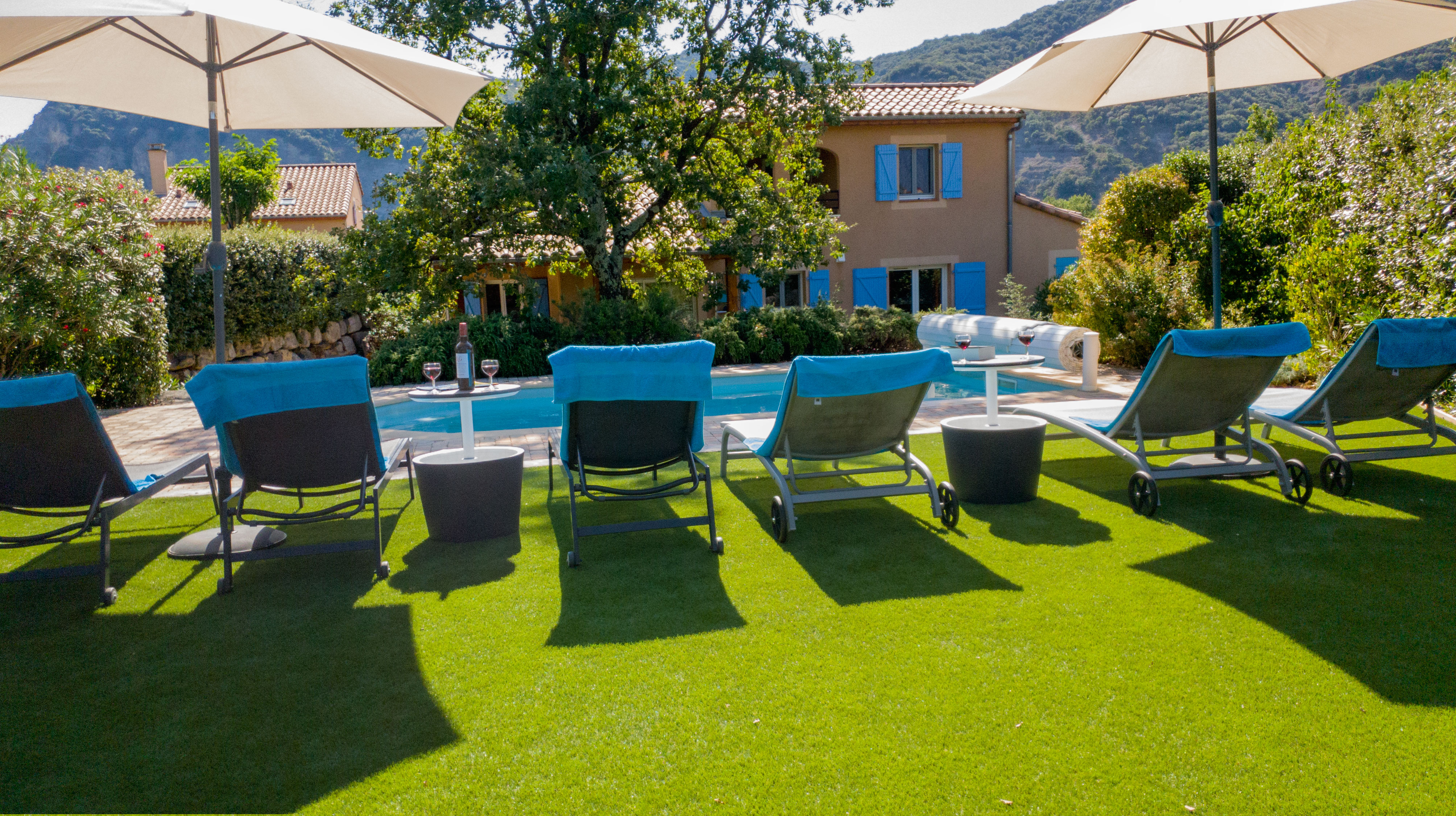 Aanzicht op villa Beau Reve met prive zwembad vanuit de achtertuin.